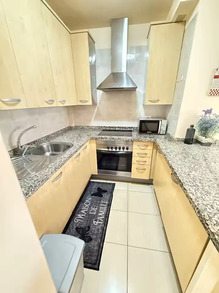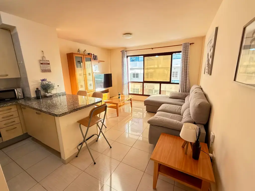 Trinimat Ferienwohnung Teneriffa Süd am Meer, El Médano Nr. 1, Wohnzimmer mit Meerblick und Sitzecke, großer Fernseher, Schreibtisch und 300 Mbit Glasfaser Internet, ideal für Homeoffice, Schlafzimmer mit einem 160 × 190 großen Bett, Badezimmer, gut ausgestattete Küche und Waschmaschine, 2 Minuten zum Sandstrand. Zu dem Endpreis müssen wöchentlich Reinigungskosten (60 €) zusätzlich bezahlt werden und sind nicht im Endpreis inklusive.
